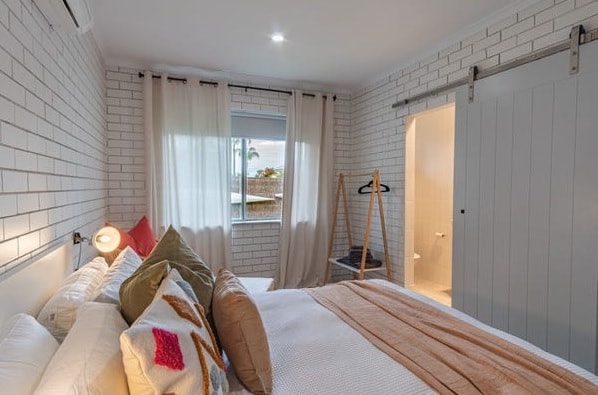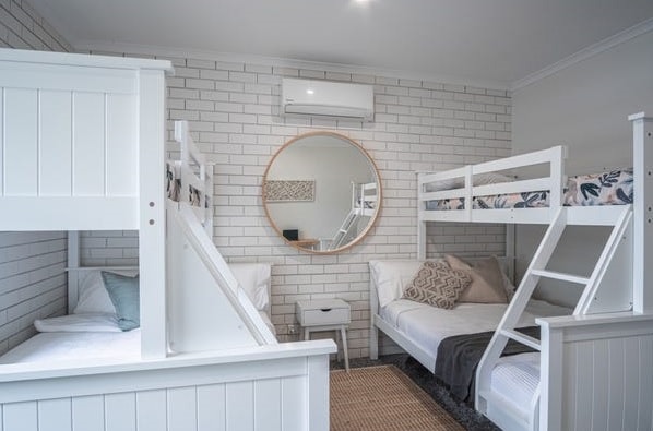 Outdoor dining, Ensuites, Separate bathroom, Showers (walk-in), Heating & Cooling, Oven & Cooktop, Everyday household cookware, Full size fridge, Dishwasher, Microwave, Toaster/Kettle, Limited condiments, Washing machine, Clothesline, Iron & Ironing board.